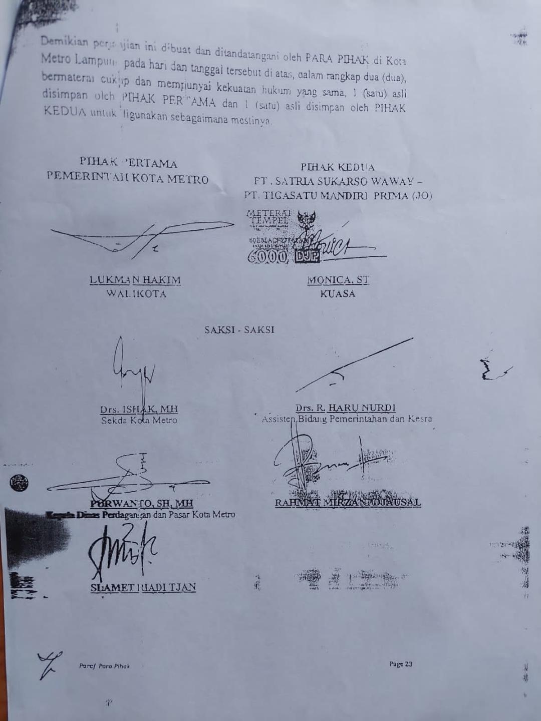 METRO – Ketua Fraksi Partai Nasdem DPRD Kota Metro, Abdulhak, menilai carut marutnya pengelolaan Terminal Kota berawal dari terjadinya perjanjian kerjasama Pembangunan Kawasan Perdagangan Kota Metro. Perjanjian dengan sistem Bangun Guna Serah antara pihak Pemerintah Kota Metro dan PT. Sukarso Waway – PT. Tiga Satu Mandiri Prima (Join Operation) yang dilakukan Tahun 2014 seperti tertuang di dalam Surat Perjanjian Kerjasama Nomor 04/KSAD/07/Setda/2014.