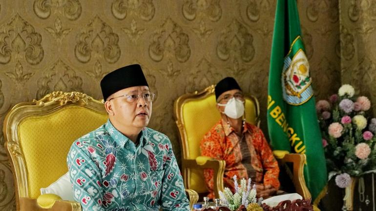 BENGKULU- Gubernur Bengkulu, Rohidin Mersyah, mengikuti Rapat Evaluasi Pembahasan Perpanjangan PPKM Mikro Diperketat dan PPKM Darurat (Zoom Meeting) dari Balai Raya Semarak Bengkulu, Sabtu (17/7).