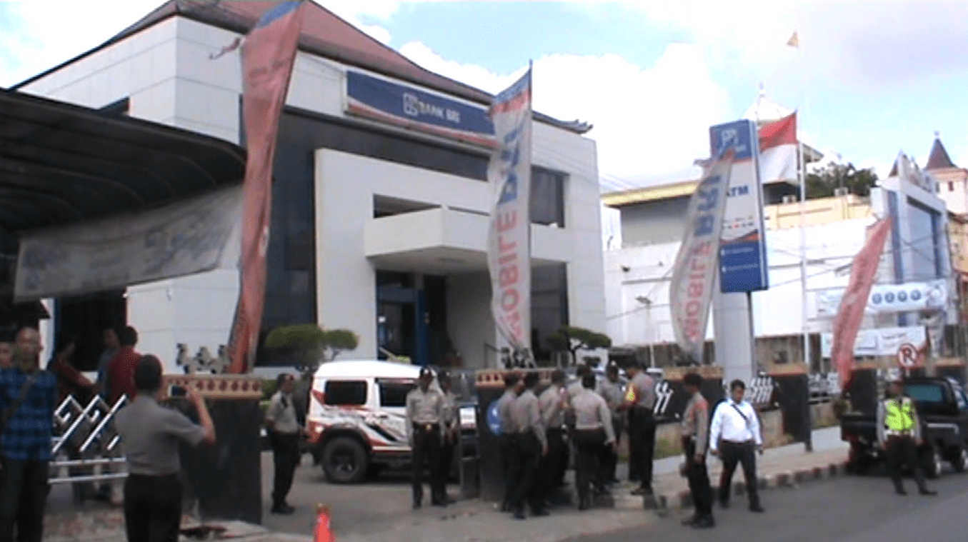 LAMPUNG UTARA- Ratusan aparat Kepolisian Resor Lampung Utara mengawal berlangsung unjukrasa di Bank BRI Cabang Kota Bumi Lampung Utara, Rabu (27/02) siang.