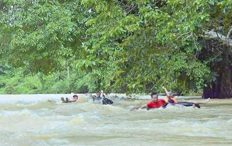 Melanjutkan rasa penasaran, crew tabikpun.com meneruskan perjalanan menuju Sungai Way Besai dengan meniti jembatan gantung untuk menyebrangi sungai. Ditemani guide/pemandu wisata yang melibatkan para pemuda dan warga setempat, kami pun diajak membuktikan mengekpolrasi lebih dalam potensi dibalik way besai. Edi Saputra koordinator guide bersama Sekretaris Dinas Pariwisata Way Kanan mengajak kami menyusuri Way Besai dengan berpetualang menggunakan Perahu Ban/ rafting atau lebih dikenal warga sekitar dengan wisata tubing. Kami pun mengikuti pemandu dengan meyusuri sungai sepanjang 7 km dengan jarak tempuh lebih kurang 2 jam. Setelah menguji andrenalin, hasil penelusuran kami mencengangkan, bukan omong kosong potensi wisata di Way Kanan tak terkecuali Kampung ini pantas mendapat julukan dengan wisata seribu curup, lantaran dalam perjalanan susur sungai Way Besai, kami menjumpai keindahan dua air terjun yaitu air terjun Batu Mahligai dan air terjun Batu Putri dengan ketinggian 7 meter yang tersembuyi dibalik bukit pada bibir sungai Way Besai dengan dikelilingi batu batu besar yang elok dipandang mata tersusun alami.